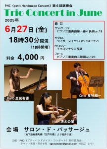 ♪2025年6月27日(金)18:30 開演 18時開場「Trio Concert in June」@サロン・ド・パッサージュ(有楽町線「江戸川橋」駅より徒歩3分) 出演者: 清水公望(vn) 夏秋裕一(vc) 里見有香(pf) 料金 4,000円 主催・問い合わせ PHC実行委員会 (sgn.tanabe@gmail.com)