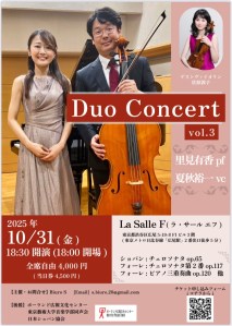 ♪2025年10月31日(金)18:30 開演 18時開場「里見有香・夏秋裕一 Duo Concert vol.3 特別ゲスト vn 佐原敦子」@La Salle F(東京メトロ日比谷線広尾駅より徒歩5分) 出演者: 夏秋裕一(vc) 里見有香(pf) 特別ゲスト佐原敦子(vn) 料金 4,000円 (当日4,500円) 主催・問い合わせ Biuro S s.biuro.20@gmail.com